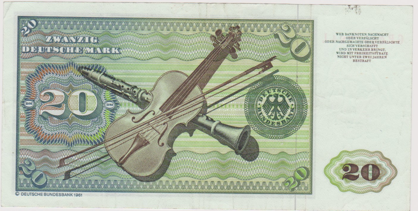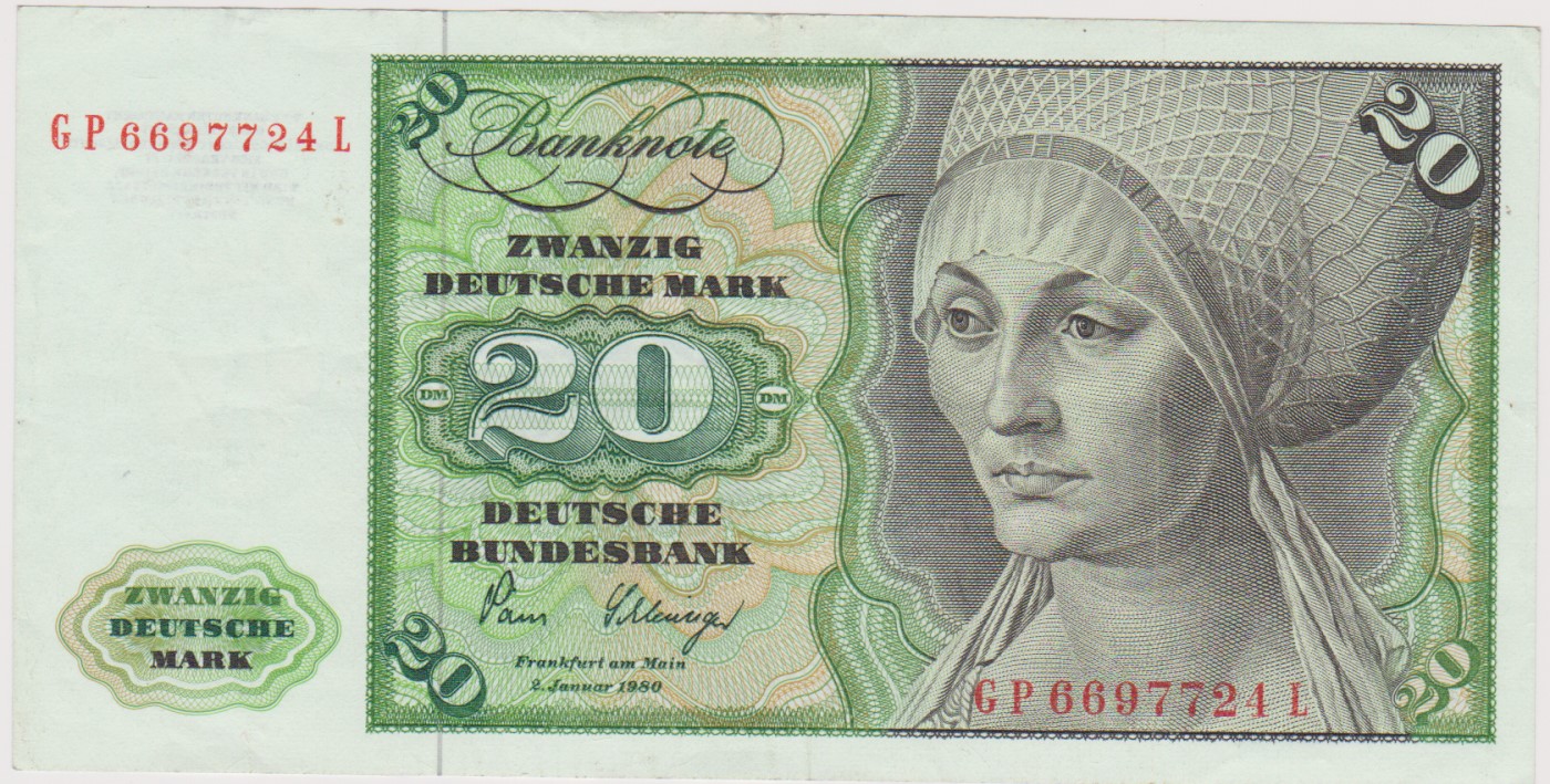 📜 Testo: La dicitura “ZWANZIG DEUTSCHE MARK” è stampata con il carattere tipografico istituzionale tedesco, sobrio e leggibile.